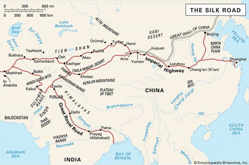 Silk Road, also called Silk Route, ancient trade route, linking China with the West, that carried goods and ideas between the two great civilizations of Romeand China. Silk went westward, and wools, gold, and silver went east. China also received Nestorian Christianity and Buddhism (from India) via the Silk Road.