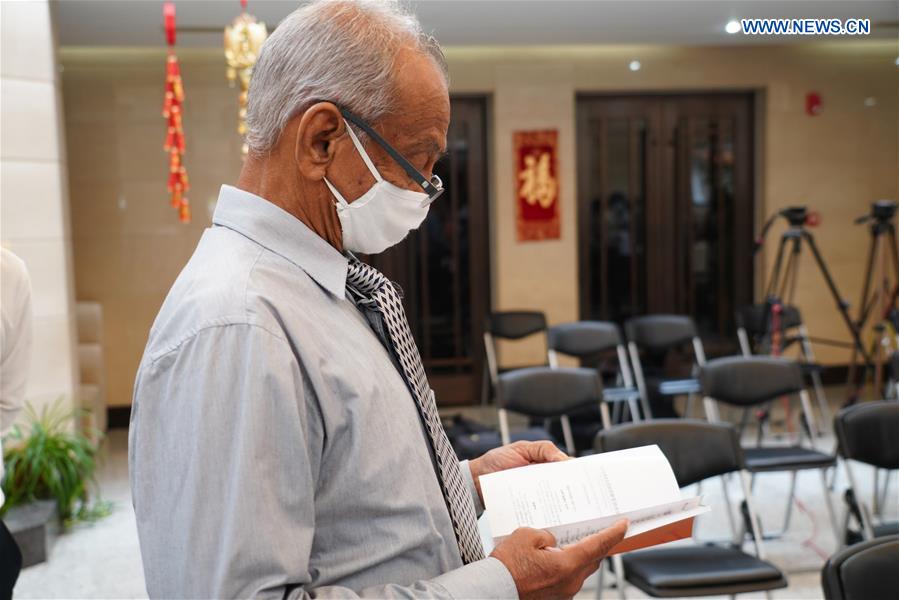 Lakshmana Saparamadu, the translator of the Chinese book "Prevention and Control of COVID-19," attends a launch ceremony of the book in Colombo, Sri Lanka, on July 30, 2020. The China-Sri Lanka Cooperation Studies Center of the Pathfinder Foundation together with the Chinese embassy in Sri Lanka launched on Thursday the Sinhalese translation of the Chinese book "Prevention and Control of COVID-19" which outlines health and preventive measures against the COVID-19 pandemic. (Xinhua/Tang Lu)