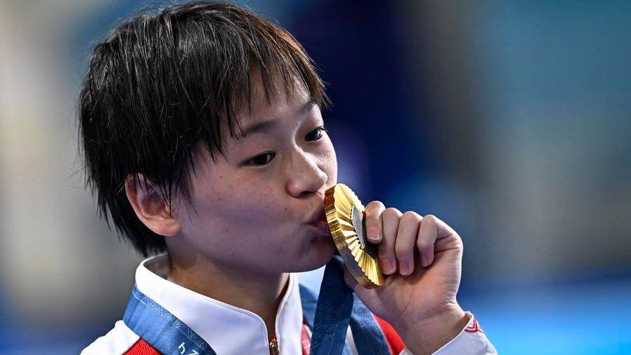 Gold medalist Quan Hongchan of China celebrates during the awarding ceremony after the women's 10m platform final of diving at the Paris 2024 Olympic Games in Saint-Denis, France, Aug. 6, 2024. (Xinhua/Wang Peng)