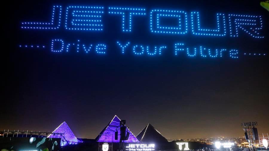 This photo taken on May 20, 2025 shows a drone show during the launching ceremony of a new lite off-road SUV model, namely T1, from Chinese auto brand Jetour at the Giza Pyramids scenic spot in Giza, Egypt. (XinhuaAhmed Gomaa)