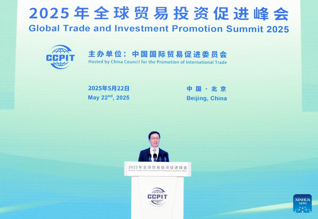 Chinese Vice President Han Zheng addresses the opening ceremony of the Global Trade and Investment Promotion Summit 2025 in Beijing, capital of China, May 22, 2025. (Xinhua/Wang Ye)
