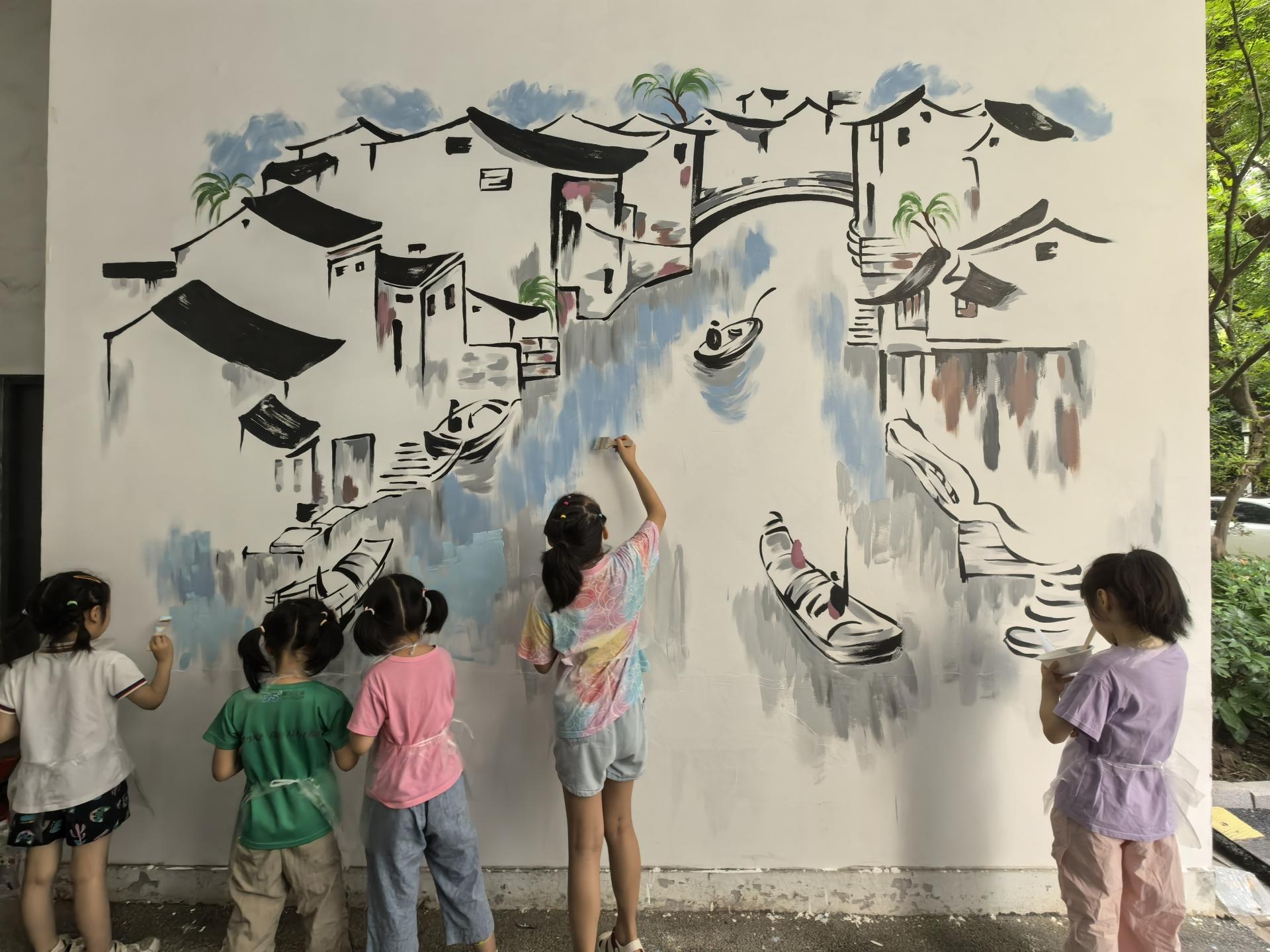 A painting event was held in the Huaqiyuan residential compound in the Beizhan Subdistrict. Guided by professional instructors, children carefully drew outlines, mixed colors, and painted vivid scenes on an old wall. Some depicted white-walled houses and black-tiled roofs, others focused on bridges and flowing water, while some added touches of willow trees to animate the mural. The once weathered wall has been transformed into a fresh landscape of Jiangnan scenery, adding a bright new feature to the community environment.