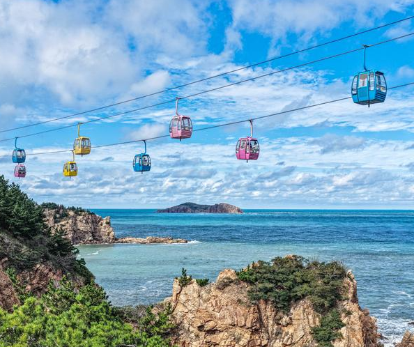 A drone photo taken on Oct. 7, 2025 shows tourists taking sightseeing cable cars at a scenic spot in Rongcheng, east China's Shandong Province. (Photo by Li Xinjun/Xinhua)