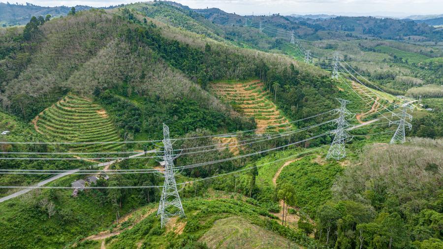 This aerial photo taken on Dec. 20, 2023 shows a view of the China-built Thung Song-Songkhla 500kV Transmission Line Project in Phatthalung, Thailand. (Xinhua/Wang Teng)