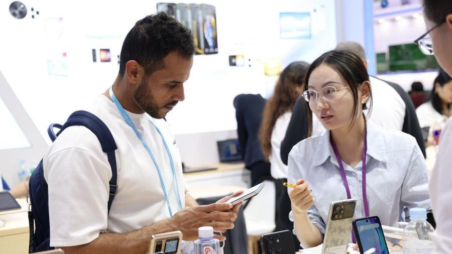 A buyer (L) learns about mobile phones during the 138th edition of the China Import and Export Fair in Guangzhou, south China's Guangdong Province, Oct. 15, 2025. (Xinhua/Lu Hanxin)