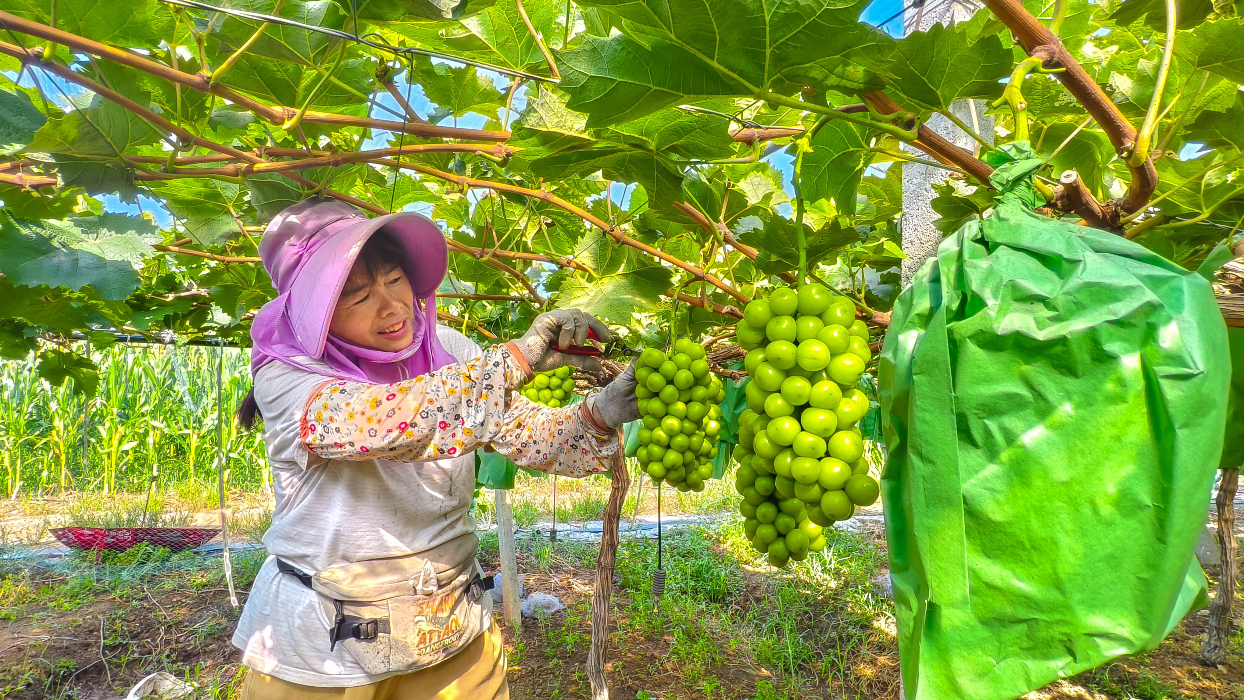 "Jinguo No. 1", a popular grape variety introduced into Huanming Family Farm recent years, enlivens local farmers as its large fruit grains, sweet taste, rich aroma, and good storage and transportation performance mean bright market prospects.