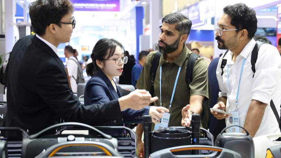 Foreign buyers learn about audio products during the 138th edition of the China Import and Export Fair in Guangzhou, south China's Guangdong Province, Oct. 15, 2025. (Xinhua/Lu Hanxin)