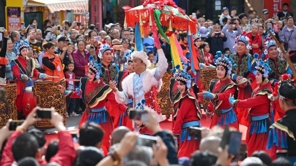 Tourists enjoy a performance at the Xinjiang International Grand Bazaar in Urumqi, northwest China's Xinjiang Uygur Autonomous Region, Oct. 1, 2025. (Xinhua/Ding Lei)