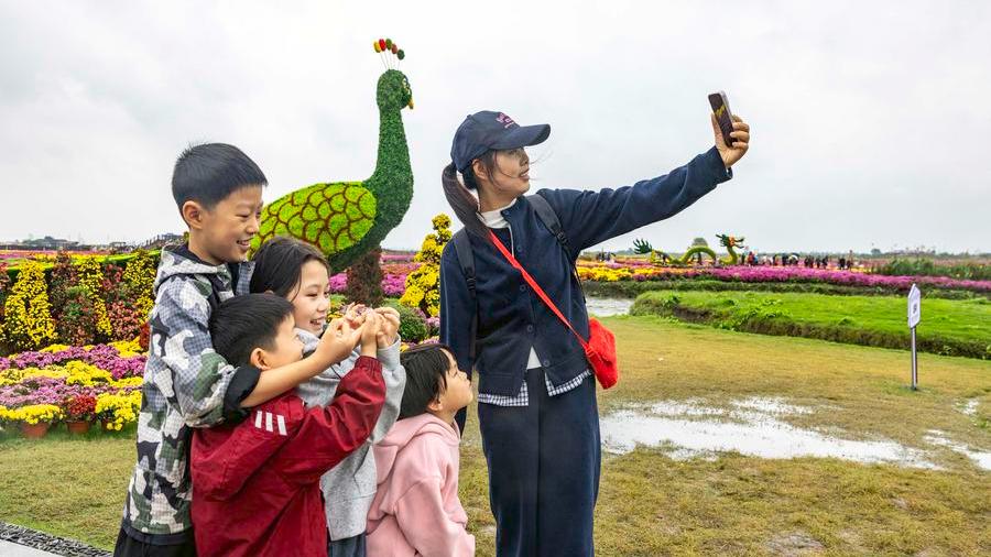 Tourists pose for photos at a scenic area in Xinghua, east China's Jiangsu Province, Oct. 18, 2025. (Photo by Tang Dehong/Xinhua)