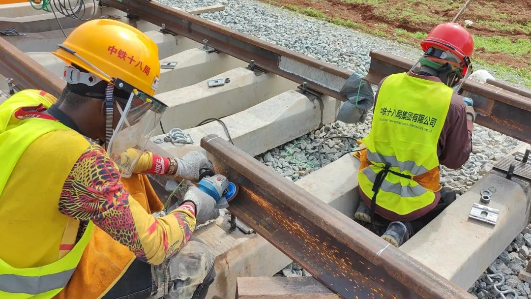 The picture shows workers grinding the rails before welding. (Photo provided by China Railway 8th Bureau Group)
