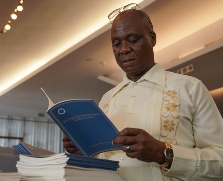 A delegate reads a report titled "Jointly Building a New Model of Global Leadership -- Work Together in Pursuit of a More Just and Rational Global Governance System" at the Global South Media and Think Tank Forum China-Africa Partnership Conference in Johannesburg, South Africa, Nov. 13, 2025 (Xinhua/Han Xu)
