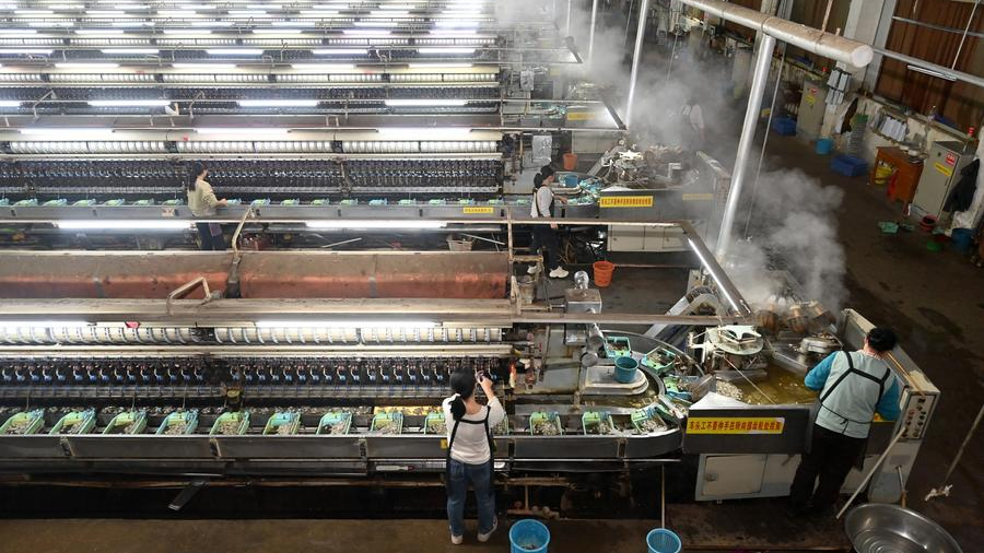 Workers are busy at a silk factory in Xincheng County of Laibin, south China's Guangxi Zhuang Autonomous Region, on Nov. 4, 2025. (Xinhua/Lu Boan)