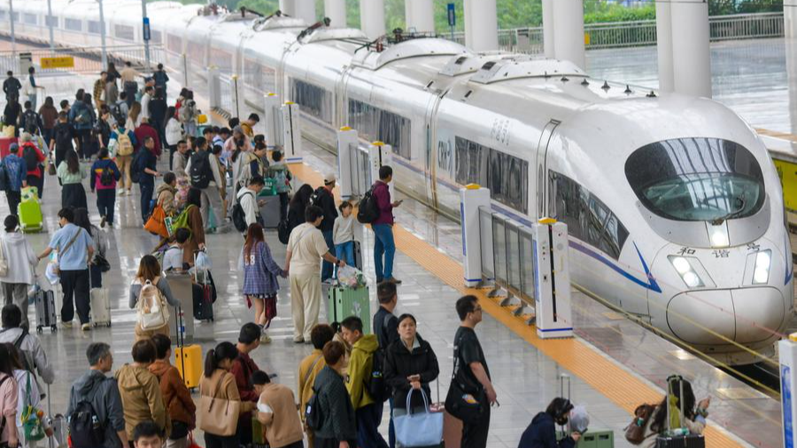 Passengers wait to board a train at Luoyang Longmen Railway Station in Luoyang, central China's Henan Province, Oct. 7, 2025. (Photo by Zhang Yixi/Xinhua)