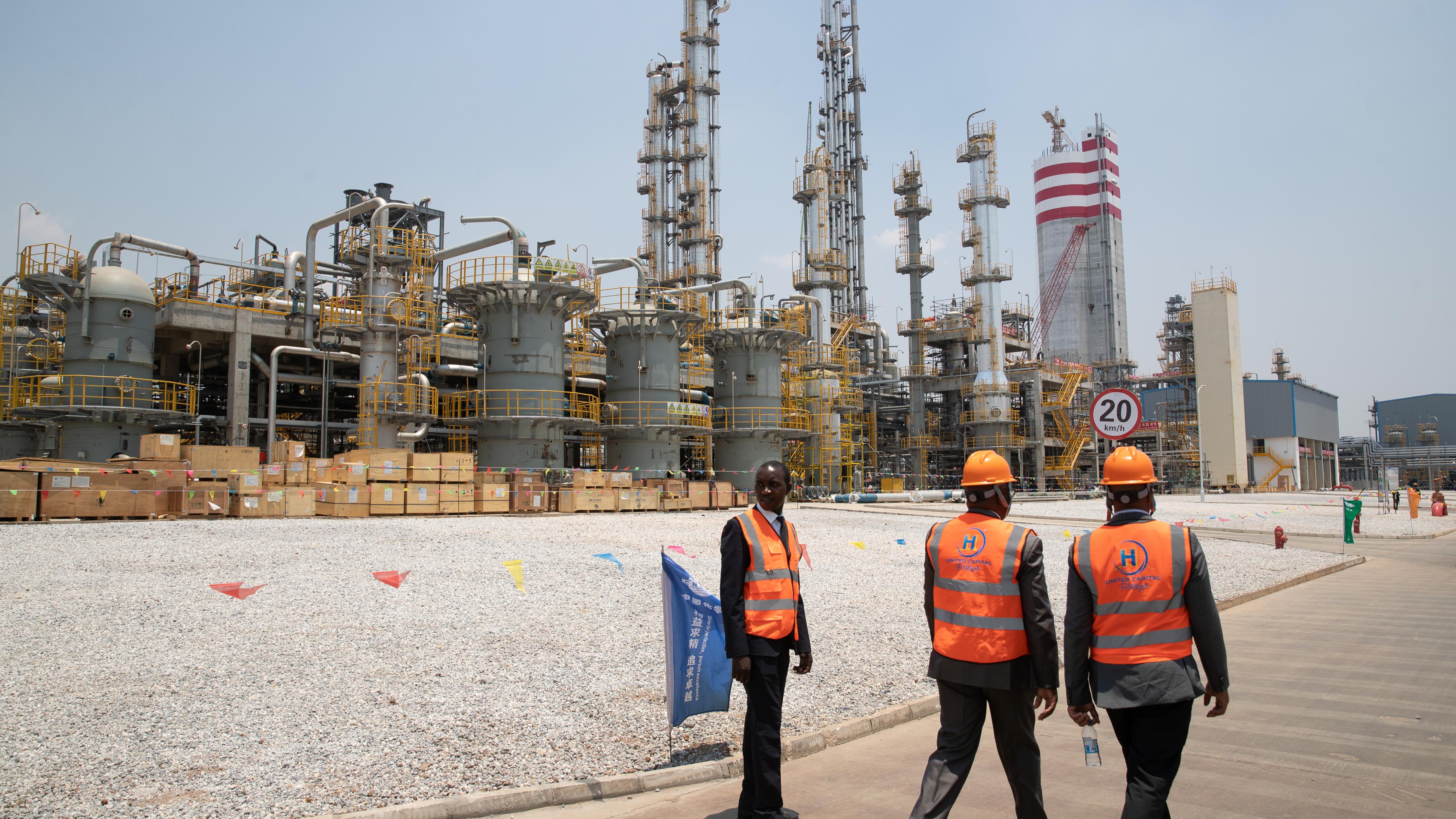 People are pictured at a China-built fertilizer plant in Chilanga district, Lusaka Province, Zambia, Oct. 16, 2025. (Xinhua/Peng Lijun)