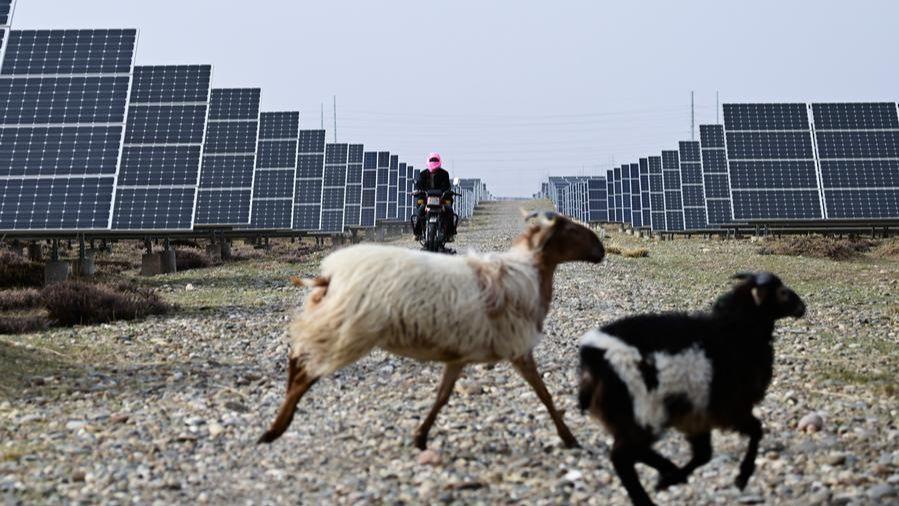 A flock of sheep graze between solar panels at a solar photovoltaic power plant in Gonghe County, Hainan Tibetan Autonomous Prefecture in northwest China's Qinghai Province, April 15, 2024. (Xinhua/Zhang Long)