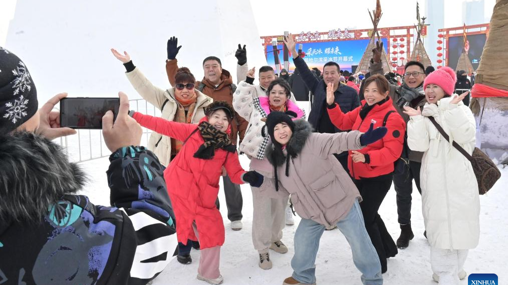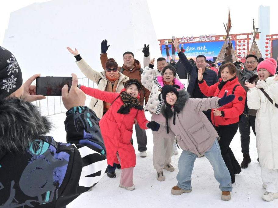 Tourists pose for photos during an ice collecting festival in Harbin, northeast China's Heilongjiang Province, Dec. 7, 2025. Marking the beginning of Harbin's ice collecting season, the sixth ice collecting festival kicked off here by the Songhua River on Sunday, attracting lots of people with ice collecting ceremony and folk custom experience activities. (Photo by Yuan Yong/Xinhua)