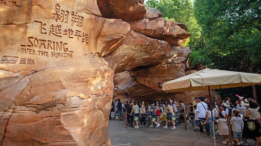 Tourists wait in line at Shanghai Disney Resort's iconic attraction, Soaring Over the Horizon, in Shanghai, east China, Sept. 19, 2025. (Xinhua)