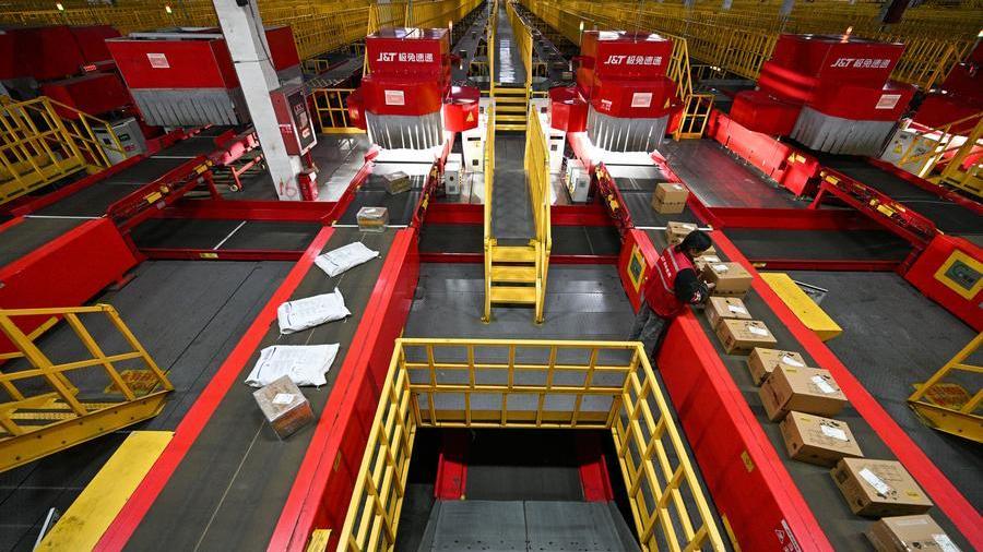 A staff member works at an automated parcel sorting line at an express hub of courier service provider J&T Express in Jiangning District of Nanjing City, east China's Jiangsu Province, Nov. 11, 2025. (Photo by Fang Dongxu/Xinhua)