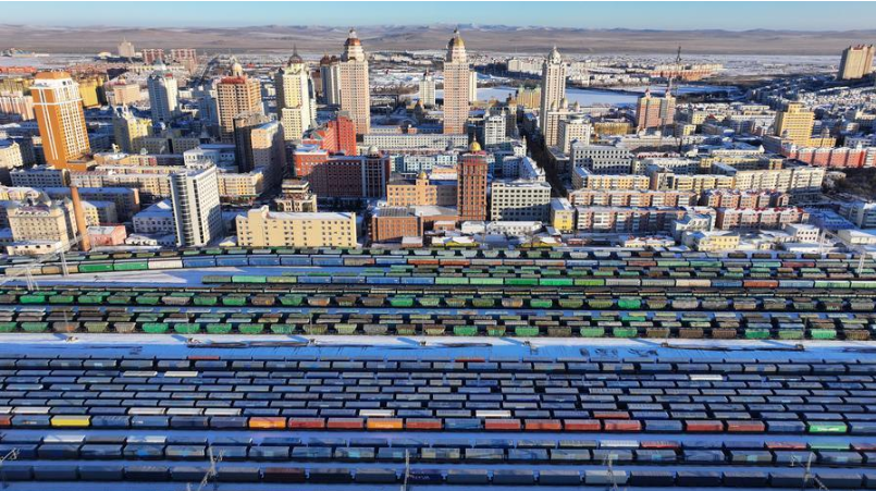 A drone photo taken on Dec. 10, 2025 shows China-Europe freight trains preparing to depart from the Manzhouli railway station in Manzhouli, north China's Inner Mongolia Autonomous Region. (Photo by Huang Xu/Xinhua)