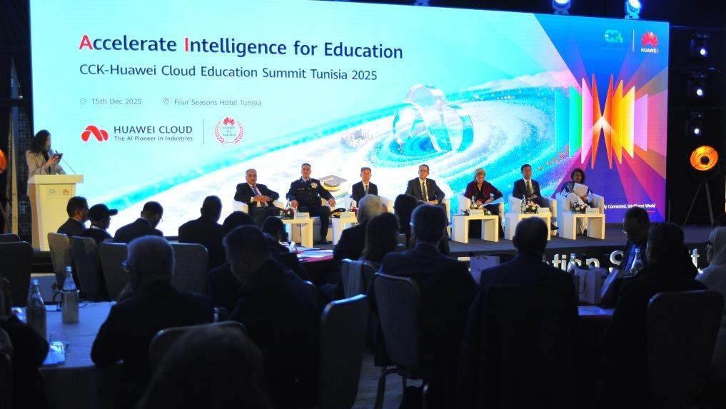 People attend a seminar in Tunis, Tunisia, Dec. 15, 2025. China's tech giant Huawei and Tunisia's Computing Center of Al-Khawarizmi (CCK) jointly held a seminar on Monday in Tunis, with the aim of enhancing Tunisia's smart education and telemedicine services. (Photo by Adel Ezzine/Xinhua)