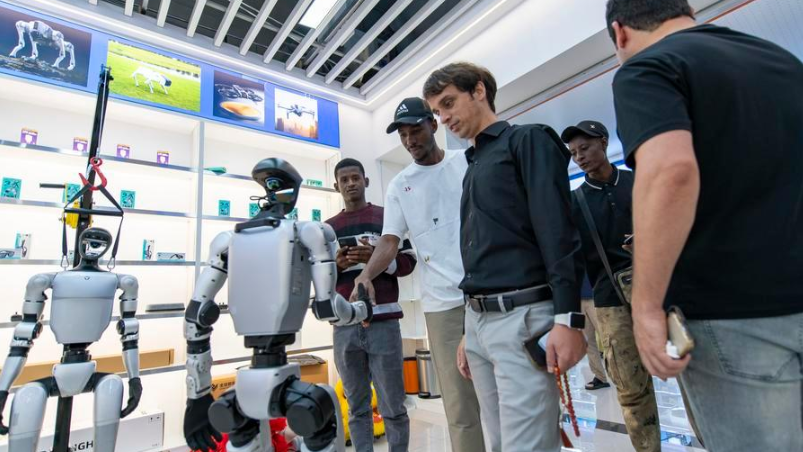 Foreign merchants interact with a humanoid robot at the Global Digital Trade Center in Yiwu, east China's Zhejiang Province, Oct. 14, 2025. (Photo by Hu Xiaofei/Xinhua)