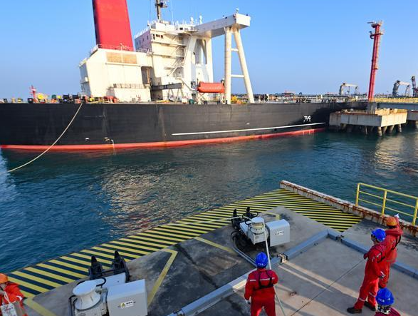 Staff members tie a mooring rope for a vessel carrying petrochemical raw materials at Yangpu Port in Danzhou, south China's Hainan Province, Dec. 18, 2025. (Xinhua/Guo Cheng)