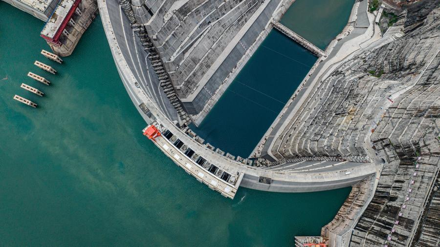 An aerial drone photo taken on June 19, 2024 shows a view of the Baihetan hydropower station in southwest China. (Xinhua/Hu Chao)