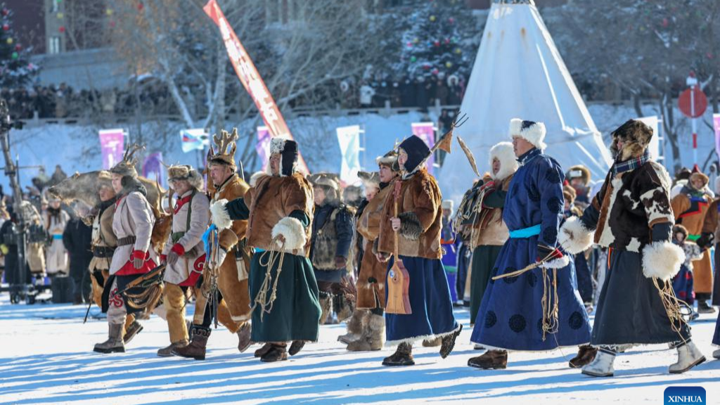A folk performance is staged during the opening ceremony of the 21st Ice and Snow Nadam Fair of the Inner Mongolia Autonomous Region in Hailar District of Hulun Buir, north China's Inner Mongolia Autonomous Region, Dec. 21, 2025. The nadam fair kicked off here on Sunday, attracting tourists from home and abroad. (Photo by Kang Wenkui/Xinhua)