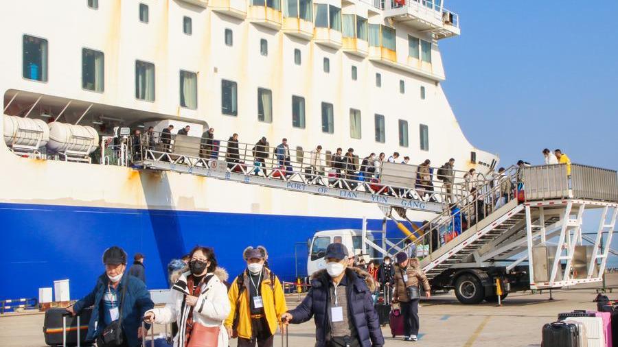 Tourists from South Korea get off from the "Harmony Yungang" cruise ship at Lianyungang Port in Lianyungang City, east China's Jiangsu Province, Dec. 28, 2025. (Photo by Wang Jianmin/Xinhua)