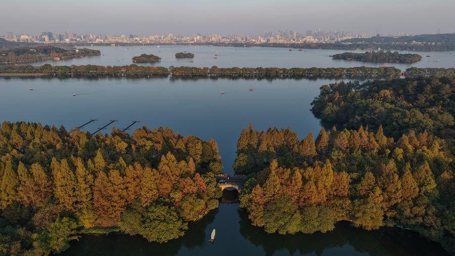 An aerial drone photo shows a view of the West Lake scenic area in Hangzhou, east China's Zhejiang Province, Nov. 21, 2025. (Xinhua/Huang Zongzhi)