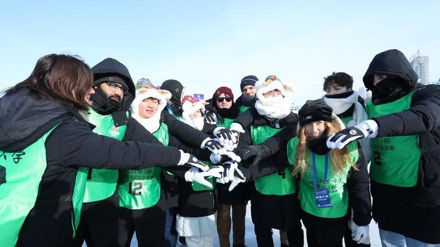 Students from Cambridge pose for a group photo before the "HIT-Cambridge-Oxford Cup" Ice Dragon Boat International Friendship Race in Harbin, northeast China's Heilongjiang Province, Jan. 10, 2026. (Xinhua)