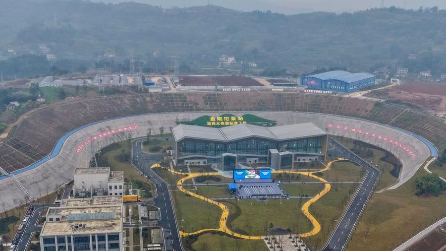 An aerial drone photo taken on Dec. 30, 2025 shows a pumping station of a water resources allocation project in southwest China's Chongqing. (Xinhua/Huang Wei)