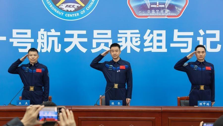 The three astronauts Chen Dong (C), Chen Zhongrui (R) and Wang Jie from China's Shenzhou-20 crewed mission salute during a press conference in Beijing, capital of China, Jan. 16, 2026. (Xinhua/Li Minggang)