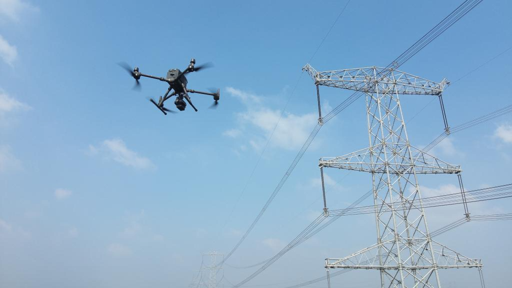This file photo taken in August 2025 shows a drone collecting data from an ultra-high voltage direct current (UHVDC) transmission line in Xuancheng, east China's Anhui Province. (Xinhua)
