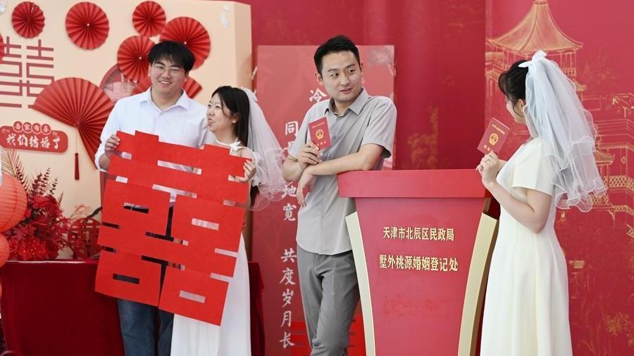 Newlyweds pose for photos at a marriage registry in Beichen District of north China's Tianjin, May 20, 2025. (Xinhua/Li Ran)
