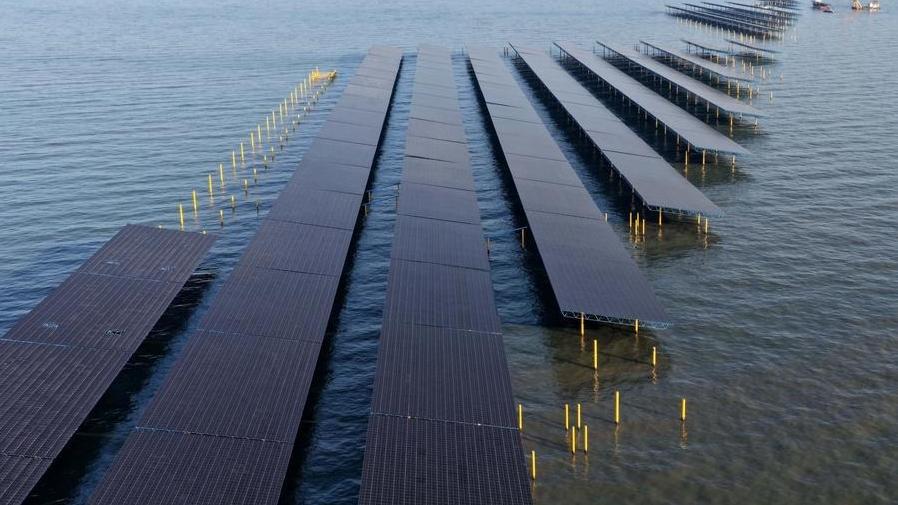 A drone photo taken on Dec. 24, 2025 shows solar panels at an offshore photovoltaic power station in waters off Changli County, north China's Hebei Province. (Xinhua/Yang Shiyao)
