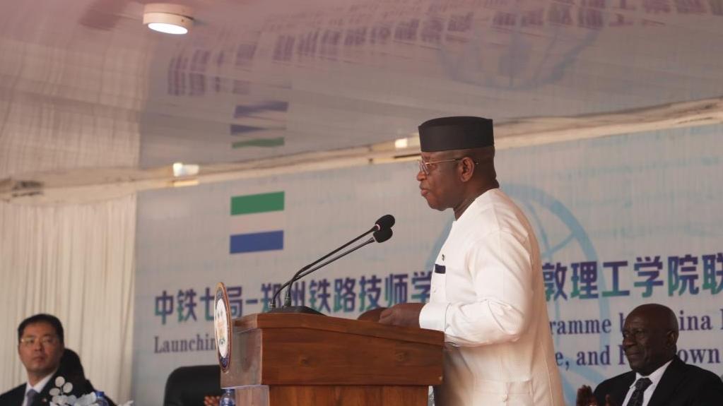 Sierra Leonean President Julius Maada Bio speaks at the inauguration ceremony of a jointly-built vocational academy in Freetown, Sierra Leone, on Jan. 27, 2026. China Railway Seventh Group Co., Ltd. (CRSG), in collaboration with Zhengzhou Railway Technician College and Freetown Polytechnic, officially launched the Excellence Skills Academy on Tuesday in Sierra Leone's capital, Freetown. (CRSG/Handout via Xinhua)