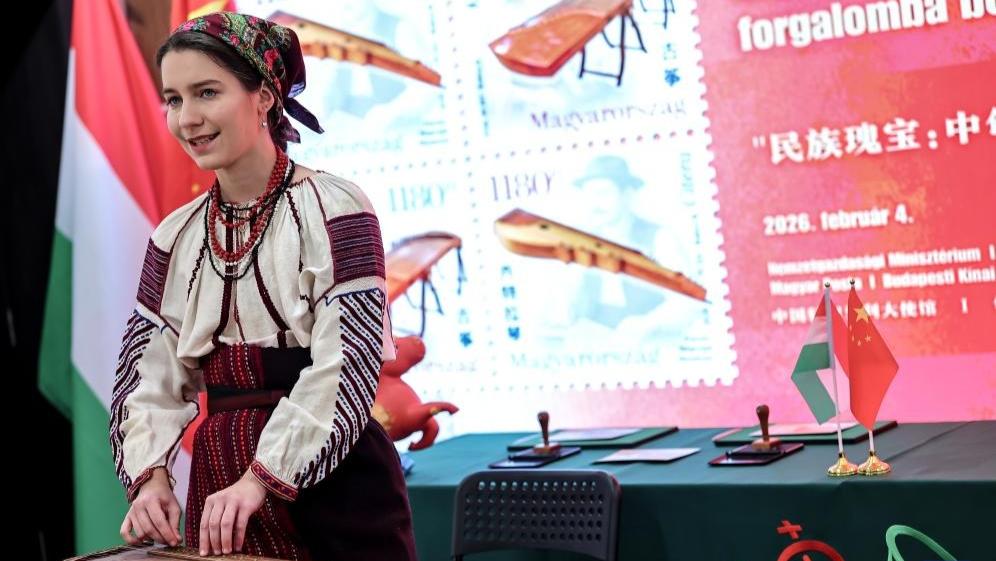 An artist plays a guzheng solo at a launch ceremony of the "National Treasures: Traditional Hungarian and Chinese Instruments" stamps in Budapest, Hungary, on Feb. 4, 2026. Hungary and China on Wednesday jointly issued a commemorative stamp series titled "National Treasures: Traditional Hungarian and Chinese Instruments" for the upcoming Chinese New Year. (Photo by David Balogh/Xinhua)