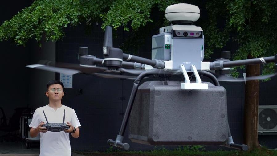 A staff member tests an unmanned aerial vehicle at the base of the United Aircraft Group in Shenzhen, south China's Guangdong Province, June 26, 2025. (Xinhua/Li An)