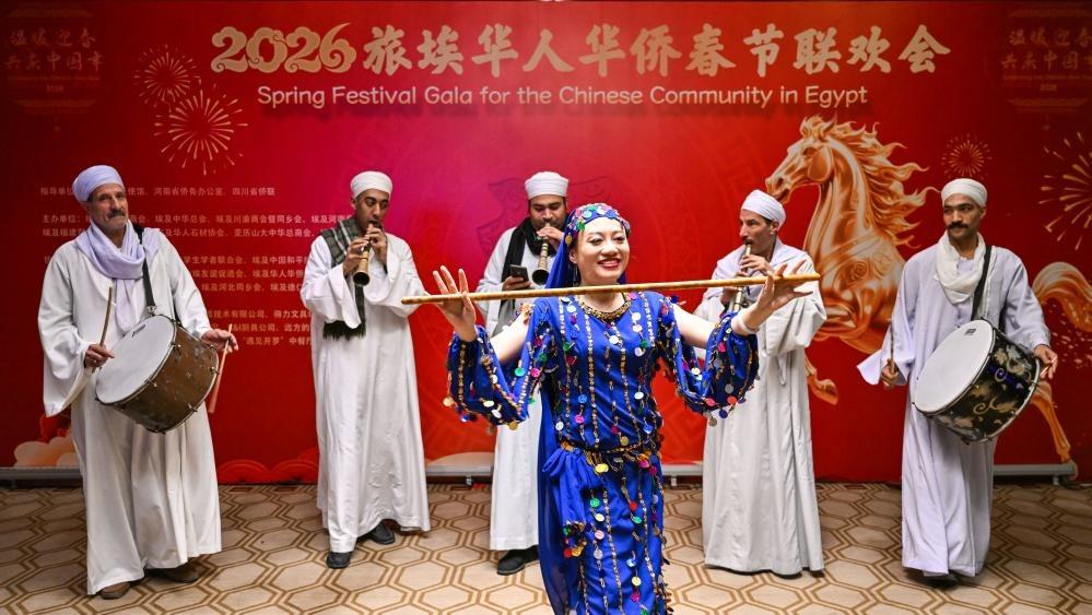 Artists perform at a Spring Festival gala in Cairo, Egypt, on Feb. 8, 2026. The gala was held here on Sunday to celebrate the upcoming Chinese Spring Festival, where participants enjoyed traditional Chinese cuisine, experienced intangible cultural heritages, and watched cultural performances. (Xinhua/Xin Mengchen)