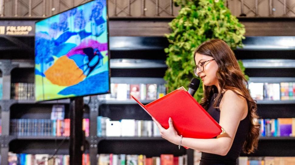 A student from the Confucius Institute at Azerbaijan University of Languages performs Chinese poetry recitation during a Chinese New Year cultural event at Baku Book Center in Baku, Azerbaijan, Feb. 11, 2026. The Confucius Institute at Azerbaijan University of Languages hosted a Chinese New Year cultural event here on Wednesday. Over 80 local audience joined students from the institute as well as representatives of Chinese-funded enterprises to enjoy performances including classical Chinese poetry recitations, classic Chinese songs, Chinese folk-style dances, and Peking Opera excerpts. (Xinhua/Chen Junfeng)