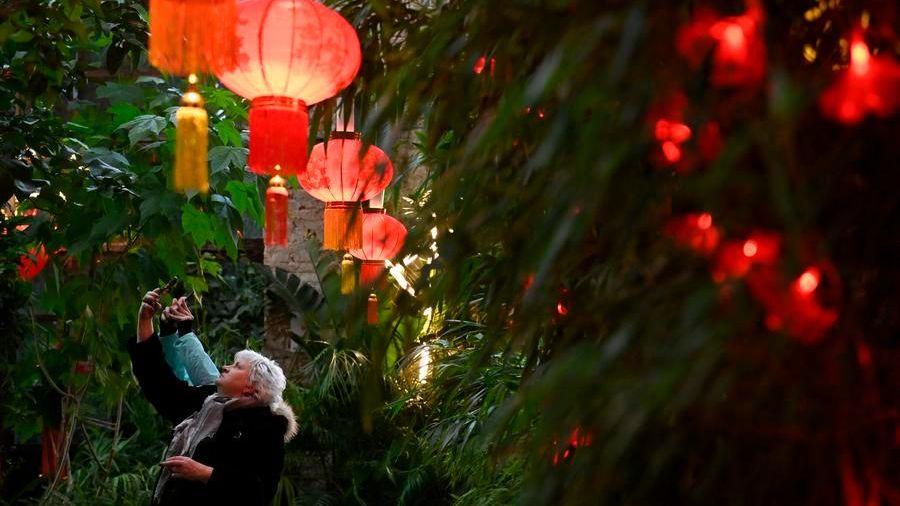 Visitors take photos of Spring Festival decorations at the subtropical greenhouse of the Moscow State University's Apothecary Garden in Moscow, Russia, Feb. 7, 2026. (Photo by Alexander Zemlianichenko Jr/Xinhua)