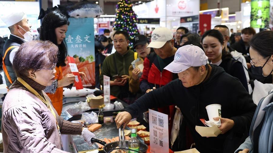Visitors taste salmon from Chile at the CIIE U-Fair in the National Exhibition and Convention Center (Shanghai) in Shanghai, east China, Dec. 19, 2025. (Xinhua/Fang Zhe)