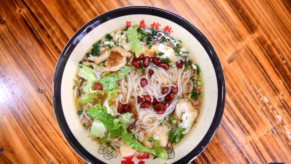 Made from all-natural ingredients, the noodles are produced through a meticulous, multi-day process that includes selecting rice, fermenting the rice, grinding into slurry, pressing out excess water, steaming and kneading the dough. The defining step is pressing the dough directly into boiling water to form strands, which are then immediately removed and served with seasonings for a fresh flavor. (Xinhua/Huang Xiaobang)
