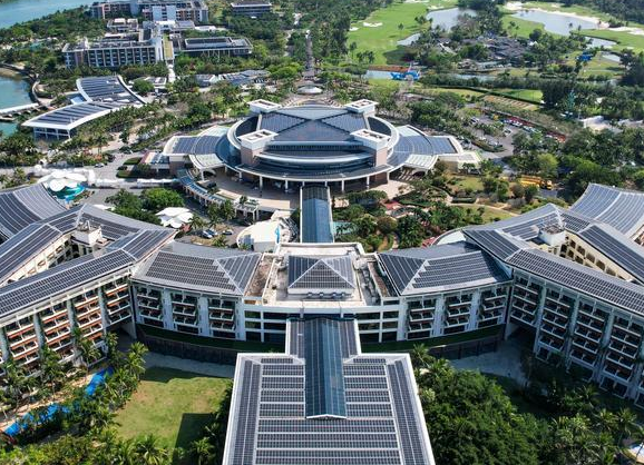 An aerial drone photo taken on March 19, 2026 shows photovoltaic devices on the roof of the Boao Forum for Asia (BFA) International Conference Center and the BFA hotel in the Boao zero-carbon demonstration zone in Boao, south China's Hainan Province. (Xinhua/Yang Guanyu)