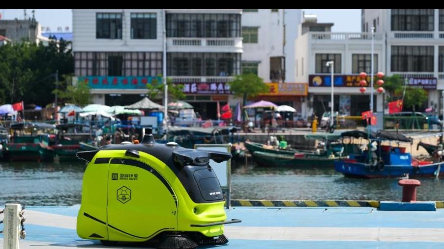 An intelligent cleaning robot works in Tanmen Town, Qionghai City, south China's Hainan Province, March 25, 2026. Smart sanitation facilities are in service during the Boao Forum for Asia (BFA) Annual Conference 2026, becoming a highlight of urban services with accurate dispatch, rapid disposal and high standards. (Xinhua/Yang Guanyu)