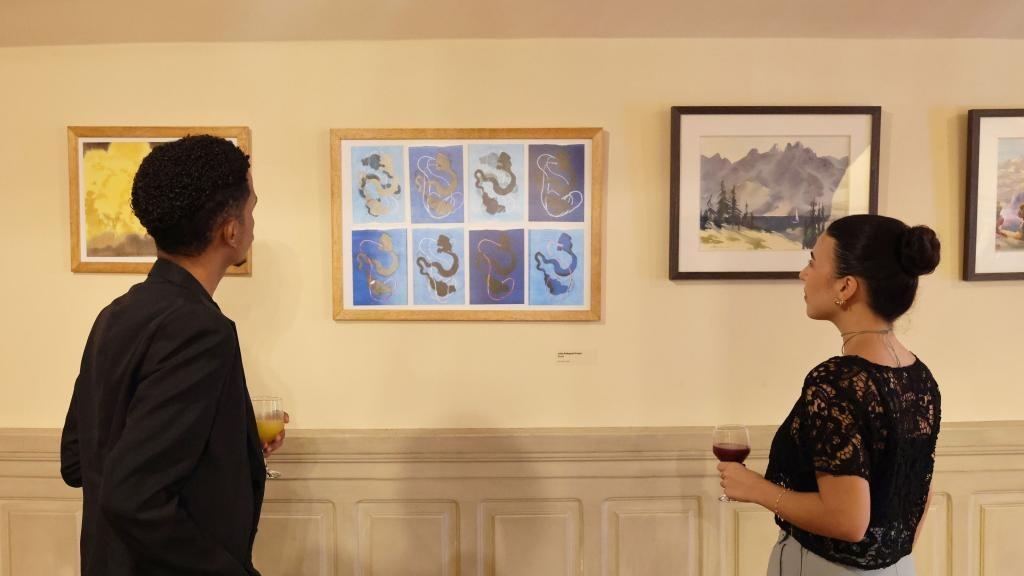 Visitors watch Brazilian paintings at a Chinese-Brazilian calligraphy and painting exhibition at the Municipal Theatre of Rio de Janeiro in Brazil, March 25, 2026. The exhibition, themed on "Horizons in Dialogue," kicked off in Rio de Janeiro on Wednesday. (Xinhua/Jin Haoyuan)