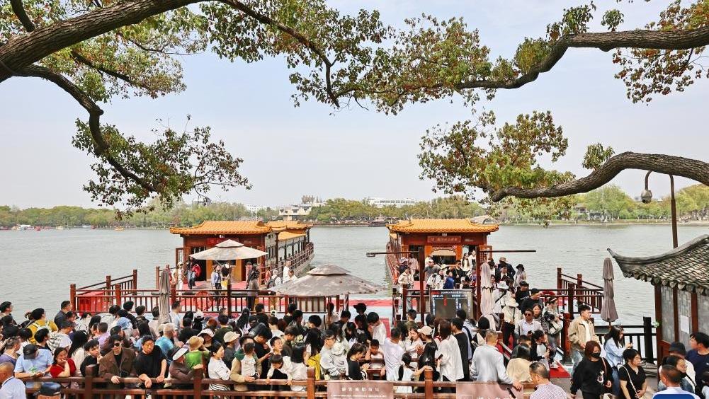 Tourists take boat rides at Nanhu Scenic Area during the Qingming Festival holiday in Jiaxing City, east China's Zhejiang Province, April 5, 2026. (Photo by Jin Peng/Xinhua)