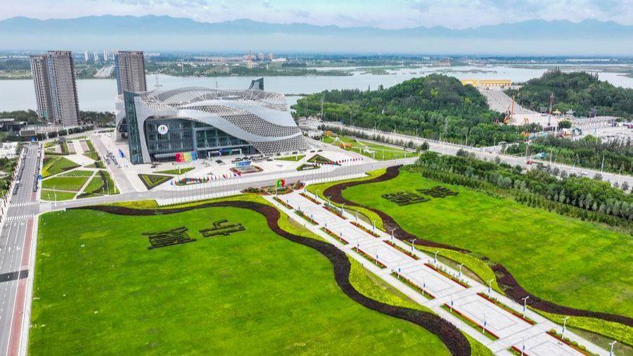 An aerial drone photo taken on Aug. 28, 2025 shows a view outside the venue of the seventh China-Arab States Expo in Yinchuan, northwest China's Ningxia Hui Autonomous Region. (Xinhua/Feng Kaihua)