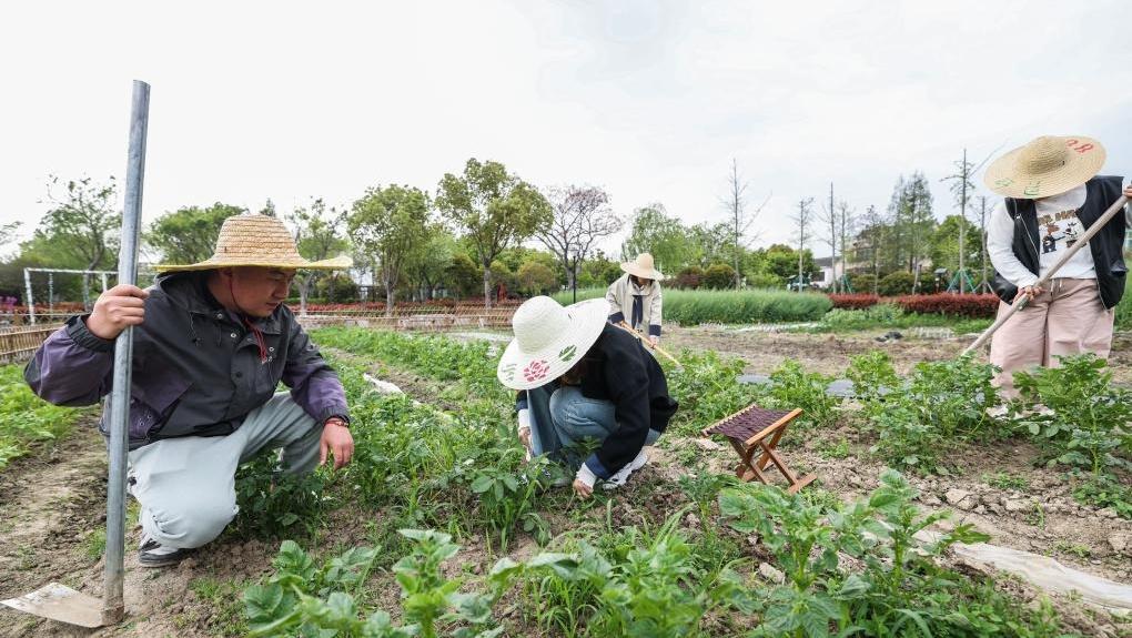 Zhu Jun (1st L), head of a shared vegetable garden, leads visitors to experience agricultural work in a field in Fengqiao Town, Nanhu District of Jiaxing City, east China's Zhejiang Province, April 8, 2026. In recent years, Nanhu District of Jiaxing City has been providing policy support, platform building, and industry incubation for returning young entrepreneurs, along with low-cost startup spaces, attracting hundreds of young people to start businesses in their hometown.